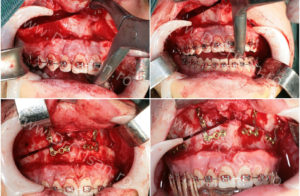 Fotografie realizata în timpul intervenției chirurgicale. Imagini cu fractura controlata a maxilarului, stabilirea raporturilor corecte, imobilizarea maxilarului în noua poziție cu ajutorul unor plăcuțe de osteosinteza.