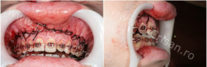 Fotografii realizate la finalul intervenției chirurgicale (foto stânga “Sutura” – foto dreapta “raport dentar post operator”), urmează restabilirea ortodontica ulterioara a raporturilor ocluzale.